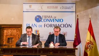 El alcalde de Campo de Criptana, Antonio Lucas-Torres, y el rector de la Universidad de Castilla-La Mancha, Miguel Ángel Collado, han hecho efectiva la firma del convenio entre ambas instituciones para la puesta en marcha del curso especializado en ‘Reproducción y genética en pequeños rumiantes ovinos y caprinos’.