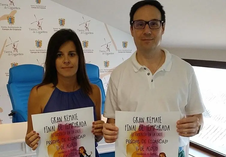La concejal de Comercio, Ana Medina, y el presidente de la Asociación de Comerciantes criptanense, Francisco Lucerón, han presentado la nueva iniciativa que el colectivo va a desarrollar este viernes 11 de agosto en la localidad. Se trata de la campaña ‘El comercio en la calle. Gran remate final de temporada’ con la que diferentes establecimientos van a instalar a lo largo de la calle Castillo sus correspondientes stands a fin de poner a la venta sus productos a precios de escándalo, tal y como reza en los carteles publicitarios.