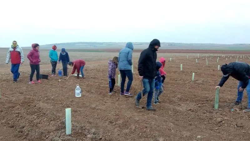 En la mañana del domingo, impetuosa, de ligero viento y llovizna pausada, que alegraba el corazón a los optimistas esperanzados aún, en que las lluvias no abandonen en demasía a nuestros campos, un grupo de voluntarios y de familias con sus hijos de Alcázar de San Juan y Campo de Criptana, nos acompañaron a plantar la últimas encinas de la temporada en el paraje de la Cañamona.