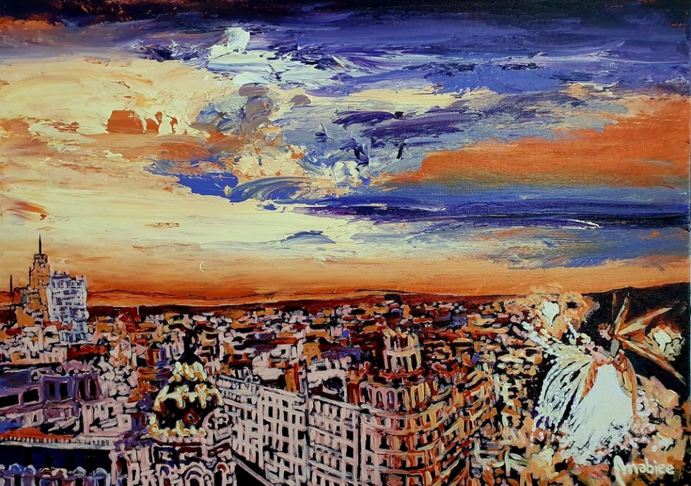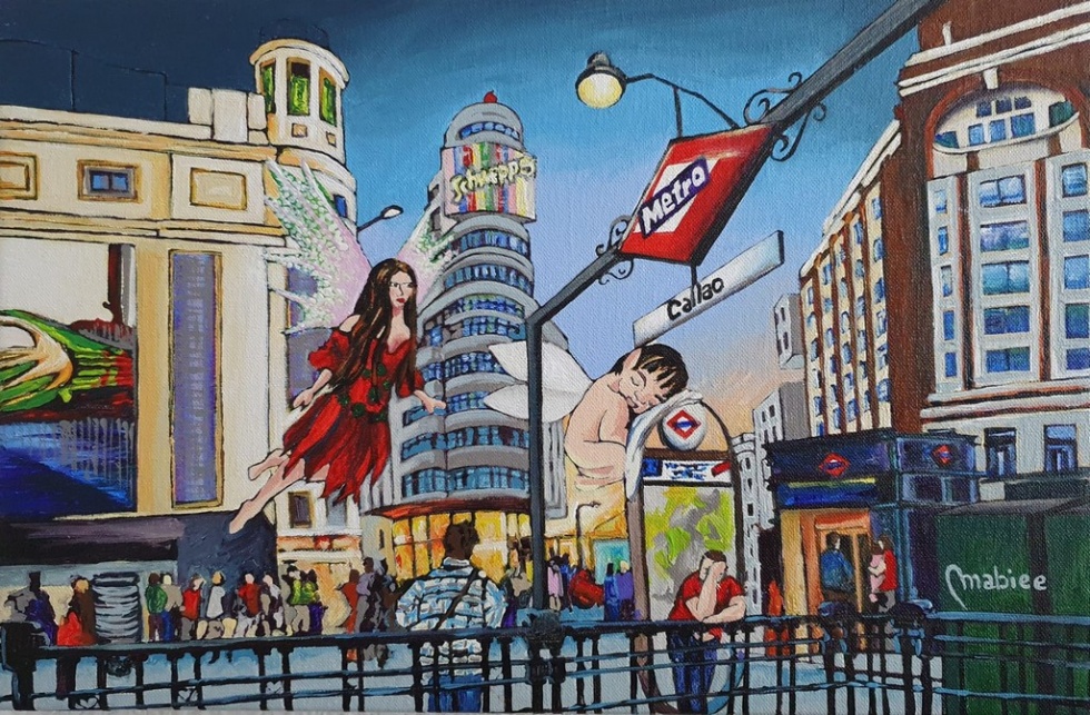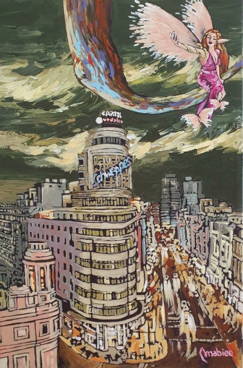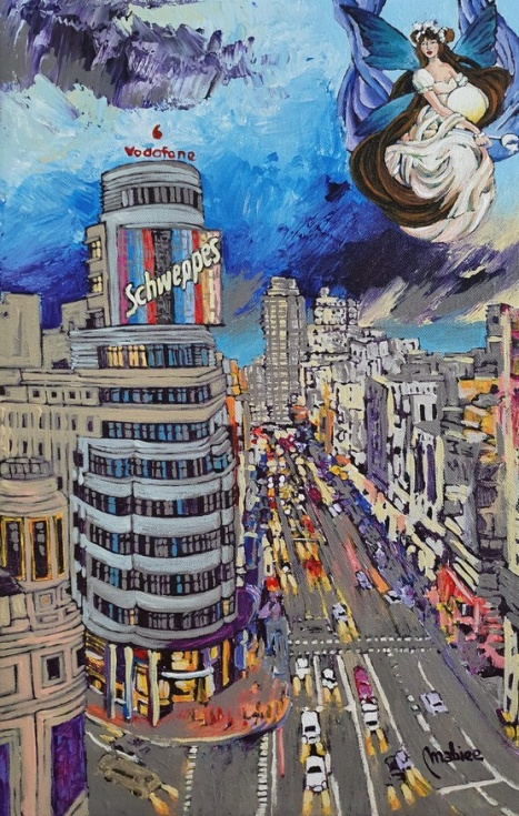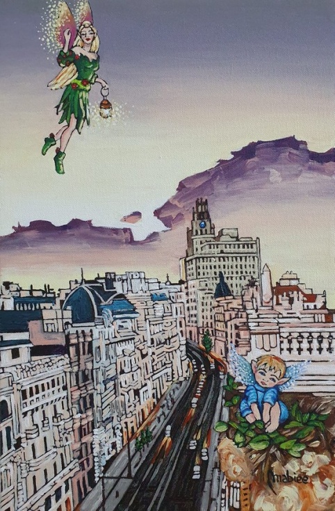 “En mis obras de arte – añade - deseaba proyectar una imagen mágica de Madrid, como que todo es posible. Según la tradición las hadas son espíritus protectores de la naturaleza, pertenecientes a la misma familia de los elfos, gnomos y duendes. Y el uso de …”.