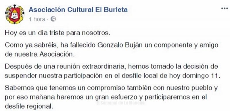 Tras el trágico suceso de anoche, la Asociación Cultural "El Burleta" de Campo de Criptana, en palabras de su presidente, Manuel Pintado, ha emitido un comunicado informando de que dicha asociación ha decidido "no desfilar" en el día de hoy domingo en Campo de Criptana "ante el brutal asesinato en el día de ayer de uno de sus miembros, Gonzalo Buján, quien era vecino de Herencia y llevaba 10 años colaborando con "El Burleta".