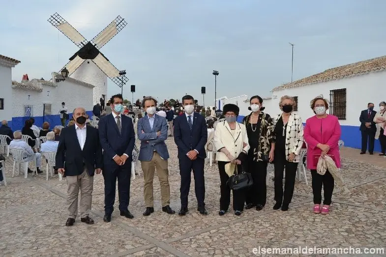 El alcalde, Santiago Lázaro, desde la Casa Cueva como centro de recepción, explicó que el año pasado no se pudo celebrar la Semana Cervantina, "pero este año, gracias a la pasión y empeño de personas como Lola Madrid, sí vamos a celebrarla y en un sitio único y mágico como el Cerro de La Paz, con el molino sardinero al fondo. Una muestra del orgullo que supone para todos tener como buque insignia de nuestro Turismo estos molinos de viento, imagen este año de Castilla-La Mancha en Fitur".