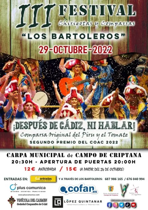 La Asociación Cultural Peña “Los Bartoleros” de Campo de Criptana vuelve con su tercera edición del Festival de Chirigotas y Comparsas. En esta nueva edición presentarán a la comparsa gaditana “¡Después de Cádiz, ni hablar!” (Original del Piru y el Tomate), quienes triunfaron en el último Concurso Oficial de Agrupaciones Carnavalescas (COAC) en Cádiz, obteniendo el segundo puesto con 700, 21 puntos.