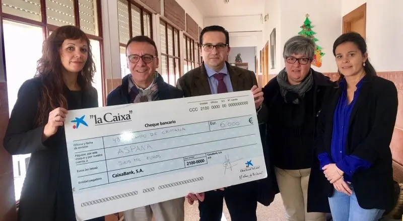 Durante la visita, la dirección de Aspana ha recibido por parte de la Obra Social La Caixa un cheque por valor de seis mil euros para ayudarles a sufragar los gastos derivados de las obras de arreglo del tejado de la vivienda tutelada. Una cantidad económica a la que se ha sumado la dotación de material electrónico, una televisión y tablets, para sus usuarios.