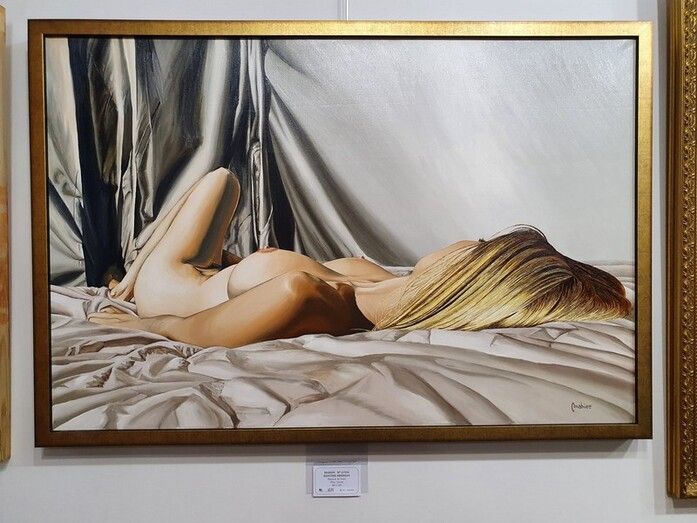 Al igual que Goya, Mabiee tiene un carácter investigador, esta vez analiza y retrata el cuerpo de una mujer reposando en una cama pero con la originalidad de una perspectiva creando una sinuosa timidez y dando profundidad a la obra.