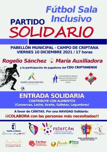 La Fundación de la Federación de Fútbol de Castilla-La Mancha en colaboración con el Ayuntamiento de Campo de Criptana, ha puesto en marcha este evento solidario entre los dos equipos de la localidad cuya sección está compuesta por deportistas con discapacidad intelectual: María Auxiliadora y Rogelio Sánchez. Para fomentar la inclusión del mismo, se contará con la participación de los jugadores del CDU Criptanense, que formarán equipo con los deportistas con discapacidad intelectual.
