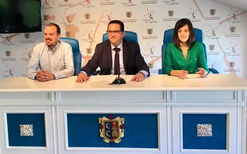 El alcalde de Campo de Criptana, Antonio Lucas-Torres; y los concejales de Cultura y Festejos, Javier López y Ana Medina, respectivamente, han presentado esta mañana, ante los medios de comunicación, un adelanto de la programación de Ferias prevista para este año. Programa en el que destacan de forma especial, en el plano musical, las actuaciones o conciertos de Pastora Soler y Seguridad Social, además de un concierto en directo de los 40 Principales.
