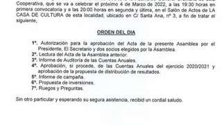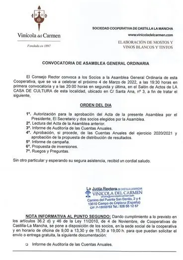 El Consejo Rector convoca a los socios a la asamblea general ordinaria de esta cooperativa que se va a celebrar el 4 de marzo de 2022, a las 19,30 horas en primera convocatoria y a las 20,00 horas en segunda y última, en el salón de actos de la Casa de cultura de Campo de Criptana, ubicado en calle Santa ana, núm 3, a fin de tratar el siguiente ORDEN DEL DÍA: