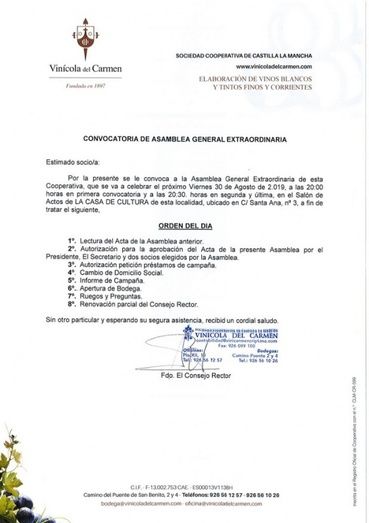Por la presente se le convoca a la Asamblea General Extraordinaria de esta Cooperativa que se va a celebrar el próximo viernes 30 de agosto de 2019 a las 20:00 horas en primera convocatoria y a las 20:30 horas en segunda y última, en el Salón de Actos de la Casa de Cultura de Campo de Criptana, ubicado en C/ Santa Ana nº 3, al objeto de tratar el siguiera fin de tratar el siguiente: