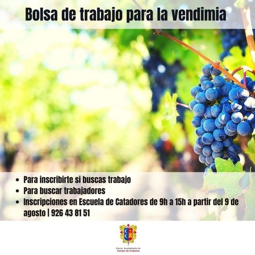 Desde el área de Agricultura del Ayuntamiento de Campo de Criptana se pone en marcha, por segundo año consecutivo, una bolsa de empleo para la vendimia. De este modo se ofrece a las personas interesadas en trabajar durante la campaña la oportunidad de inscribirse y ampliar las posibilidades de encontrar empleo. De la misma forma, se agiliza y facilita la búsqueda de mano de obra a los empresarios que durante los meses de agosto y septiembre tienen que realizar esta labor.