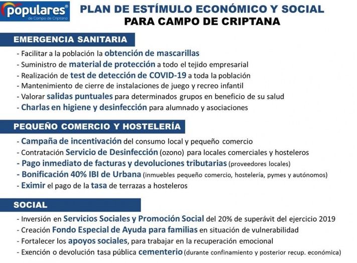 El Partido Popular criptanense, a través de este grupo municipal en el consistorio, para paliar esta situación, ofreció su ayuda al equipo de gobierno presentando públicamente, hace ya varias semanas, un paquete con 46 medidas económicas, sociales, sanitarias, educativas e institucionales para afrontar crisis provocada por el Corona Virus. Del mismo modo, desde el Grupo Popular se presentó, hace días, una solicitud al equipo de gobierno para la creación de un órgano gestor del COVID-19, con la esperanza de poder debatir sus propuestas no solamente con el equipo de Gobierno, sino también con los grupos de la oposición y con los principales agentes económicos del municipio. Debate que lejos de crear crispación en estos momentos tan delicados, lo que busca es enriquecer las medidas que deben ser aportadas y puestas en marcha y que para muchos empresarios, autónomos y familias de la localidad llegan tarde.