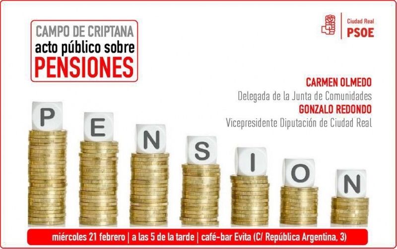 El PSOE de Ciudad Real ha organizado una asamblea abierta esta tarde, en Campo de Criptana, bajo el lema "Pensiones dignas". Un acto que se celebrará a partir de las 17 horas, en Café Bar Evita, situado en el número 3 de la calle República Argentina.