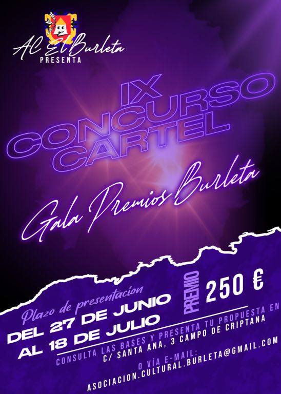 Las bases del IX Concurso del Cartel pueden consultarse en la página oficial del Burleta en Facebook: “Asociación Cultural El Burleta” y en caso de duda, pueden ponerse en contacto con la Junta Directiva a través de Facebook o del correo: asociacion.cultural.burleta@gmail.com