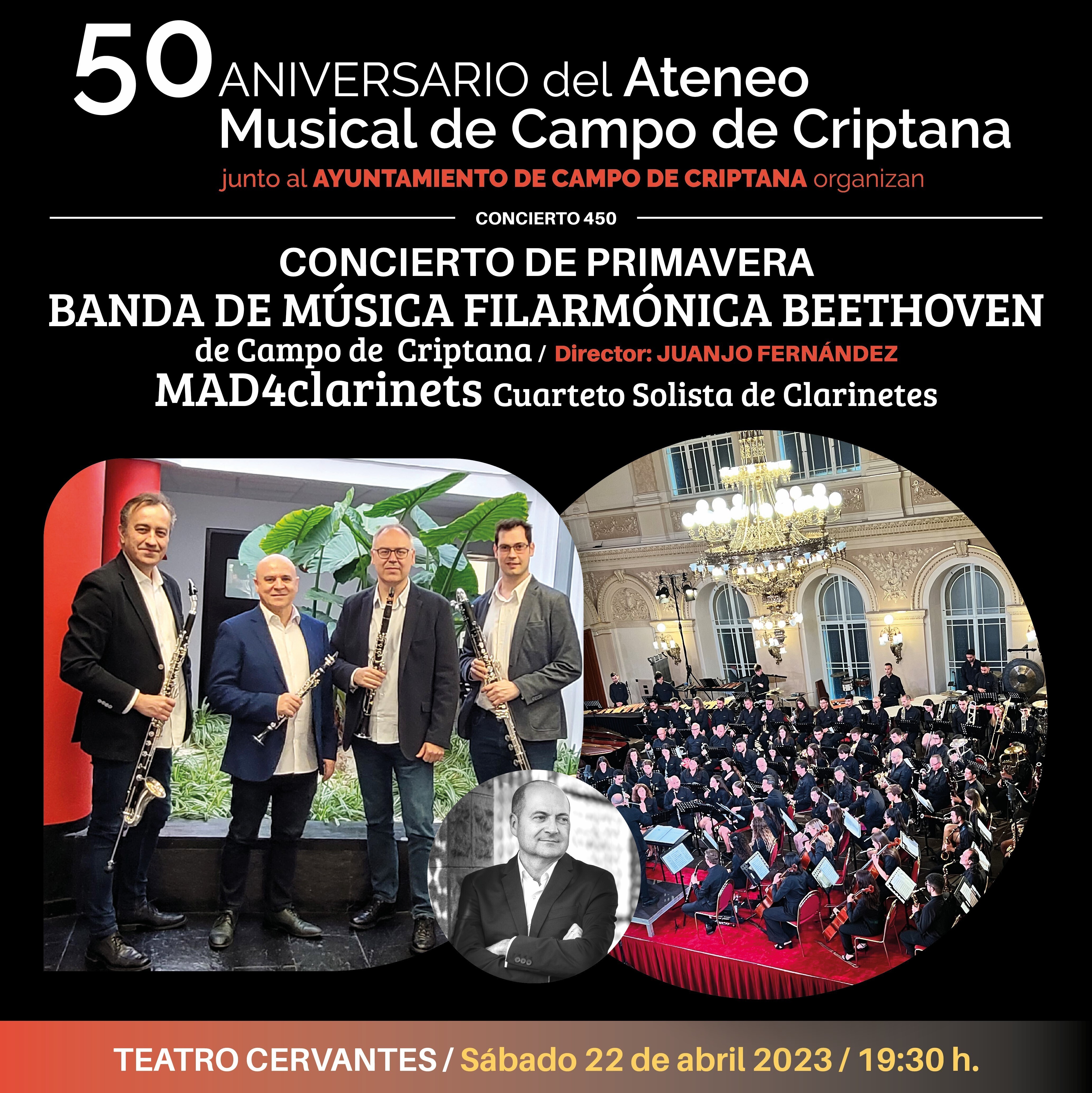 Este sábado 22 de abril, a las 19:30 h. en el Teatro Cervantes, el Ateneo Musical de Campo de Criptana celebra, junto al Ayuntamiento de Campo de Criptana, el Concierto de Primavera: Banda de Música Filarmónica Beethoven de Campo de Criptana bajo la dirección de Juanjo Fernández y Mad4clarinets como solistas Interpretarán dos conciertos escritos para cuarteto de clarinetes solistas y Banda. Estos cuatro excelentes músicos, además y en colaboración con el Conservatorio de música, realizarán masterclass aprovechando su visita para los ensayos del concierto.