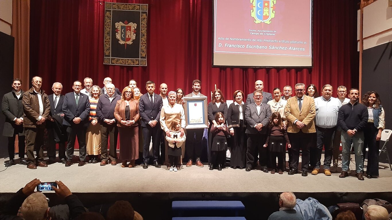 El municipio de Campo de Criptana celebró ayer sábado en el Teatro Cervantes el acto de nombramiento de Francisco Escribano Sánchez-Alarcos como Hijo Predilecto a título póstumo. Un reconocimiento aprobado por unanimidad en el Pleno Municipal, en homenaje a su labor como cronista oficial, docente e investigador incansable de la historia local.