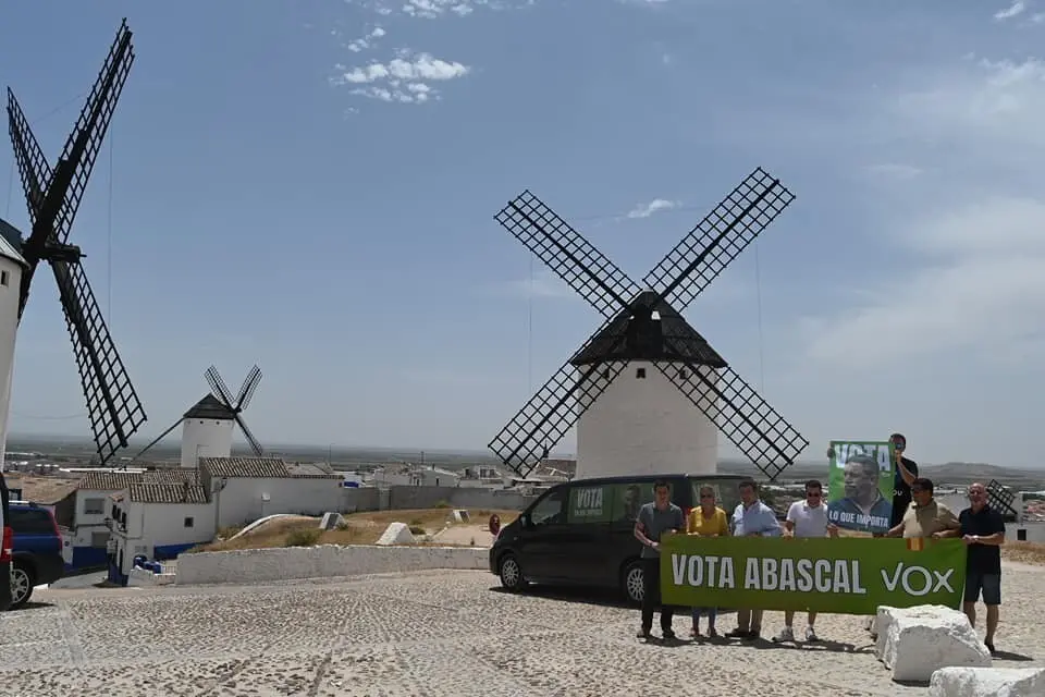 La jornada del lunes llevó a la caravana de VOX hasta Campo de Criptana para mantener un encuentro con los afiliados y visitar la localidad repartiendo propaganda electoral del partido.