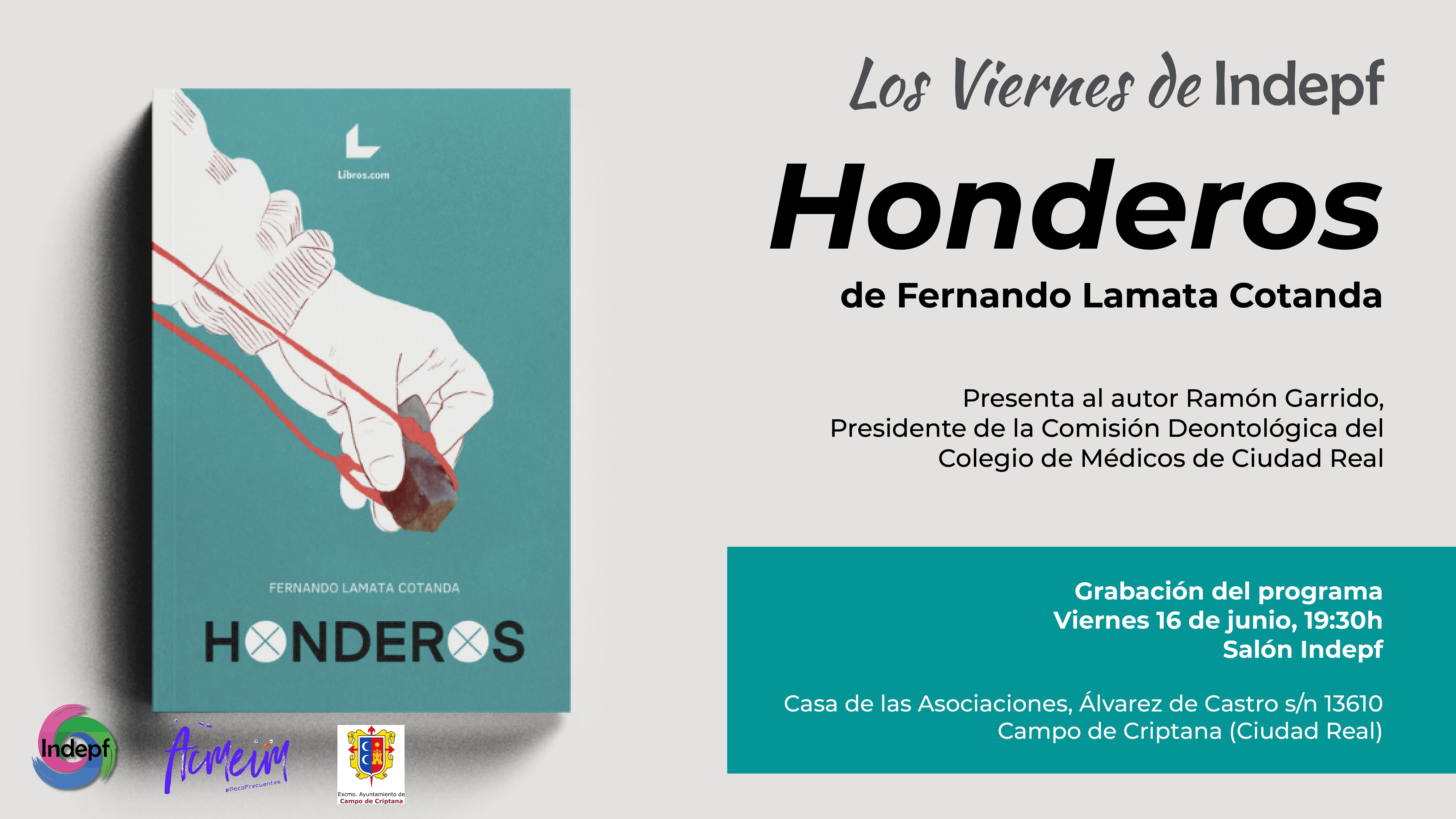 El autor de “Honderos”, novela escrita por Fernando Lamata Cotanda, exconsejero de Salud y Servicios Humanos de la Junta de Comunidades de Castilla-La Mancha, participará el próximo viernes, 16 de junio, en una charla organizada por la Asociación de Enfermedades Poco Frecuentes en Campo de Criptana. Presentará al autor el pediatra Ramón Garrido, presidente de la Comisión Deontológica del Colegio de Médicos de Ciudad Real.