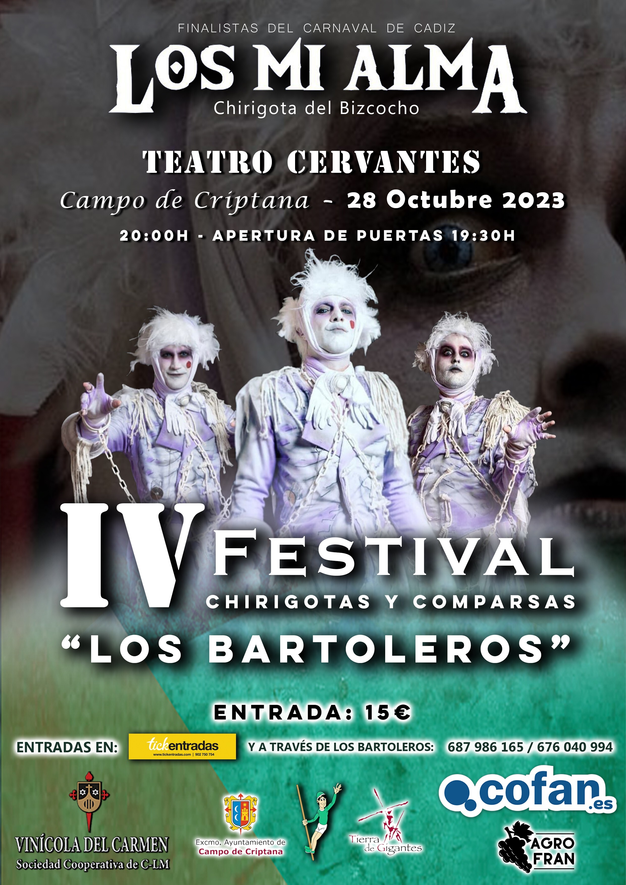 La Asociación Cultural Peña “Los Bartoleros” de Campo de Criptana vuelve en el mes de octubre con la cuarta edición del Festival de Chirigotas y Comparsas. En esta nueva edición presentarán a la Chirigota del Bizcocho con “Los mi alma”, finalistas del Carnaval de Cádiz.