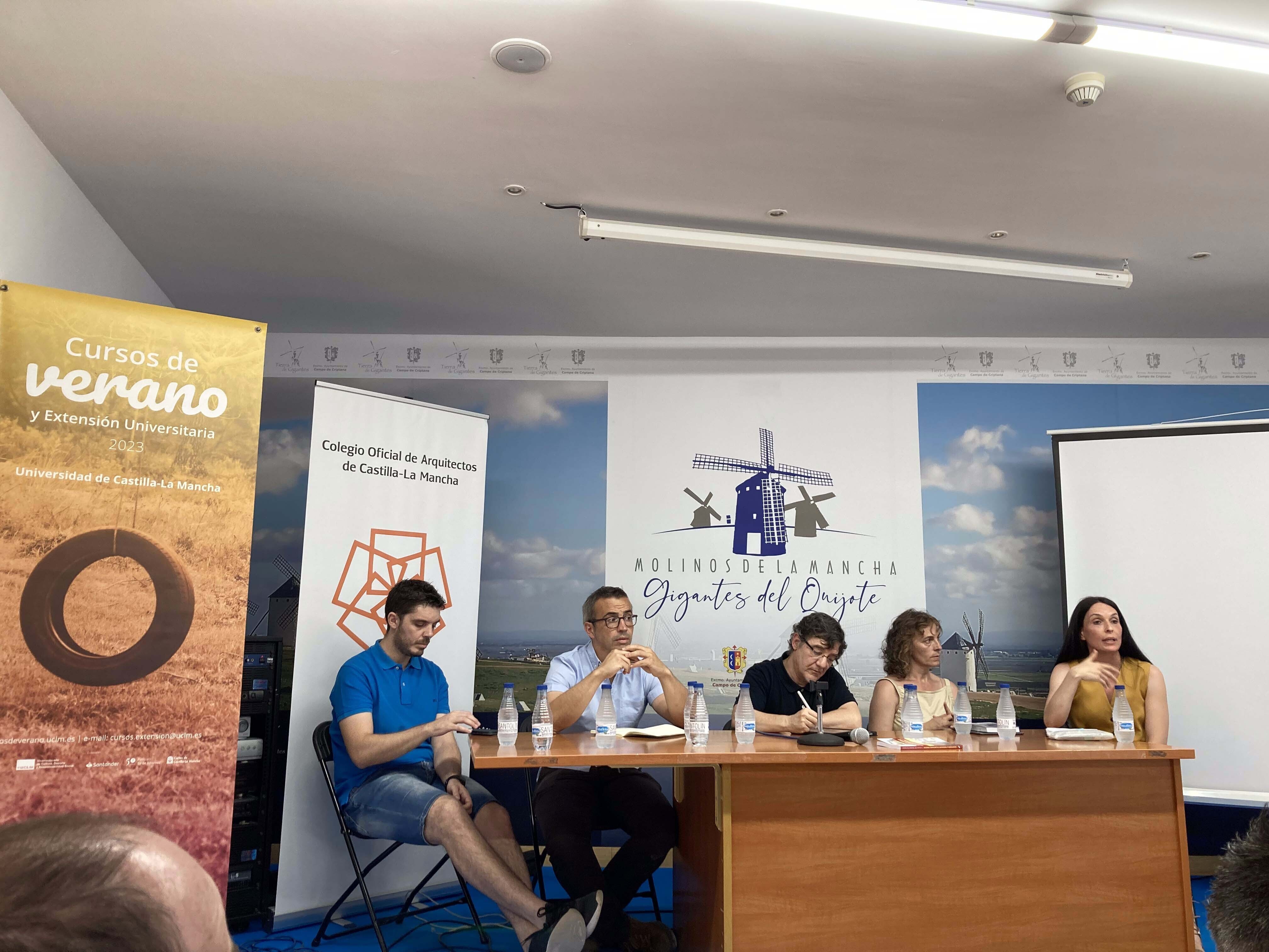 La Mesa Redonda con la que se cerraron las jornadas estuvo coordinada por profesor de Urbanismo Francisco Javier Rodríguez. En ella intervinieron Gema González-Badillo, vicedecana del COACM, exponiendo su experiencia en la viabilidad económica de proyectos para la red de Hospederías de CLM, como recurso necesario en muchas zonas con deficiente infraestructura hostelera. Así lo demandó, por ejemplo, la edil de Turismo de Campo de Criptana. Otros participantes locales también explicaron sus experiencias. Miguel Torres, arqueólogo y director del yacimiento de la Motilla del Azuer de Daimiel, y David Cejudo, presidente de la Asociación Cultural Venta de Borondo y Patrimonio Manchego, destacaron la gran oportunidad que tiene la comarca al contar como recurso turístico de relevancia internacional: el lugar donde se desarrolla la novela más importante del mundo, que atrae un turismo literario, que busca experiencias. Ambos coincidieron en que hay que incorporar nuevos recursos que complementen el icono del molino de viento. En Daimiel cuentan con recursos medioambientales como las Tablas; históricos. como un yacimiento arqueológico y un museo comarcal, además de ejemplos de arquitectura moderna y popular.