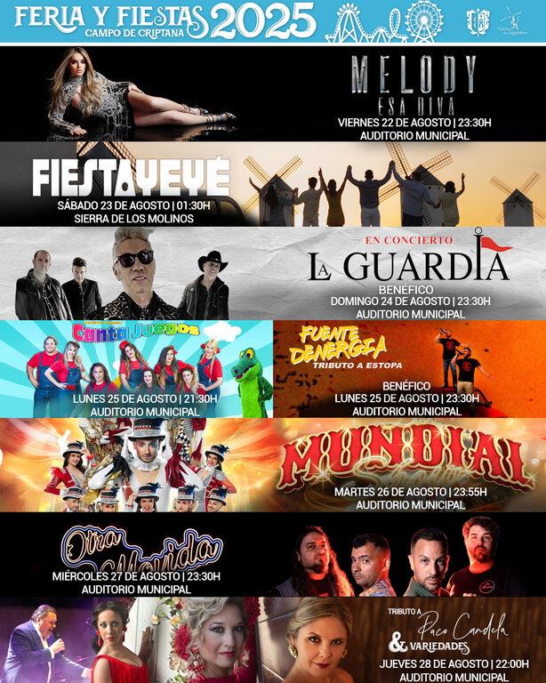 El Ayuntamiento de Campo de Criptana ya ha puesto a la venta las entradas para todos los conciertos programados con motivo de la Feria y Fiestas 2025, que se celebrarán entre el 22 y el 28 de agosto. Los tiques pueden adquirirse a través de la plataforma globalentradas.com y de forma presencial en El Pósito.