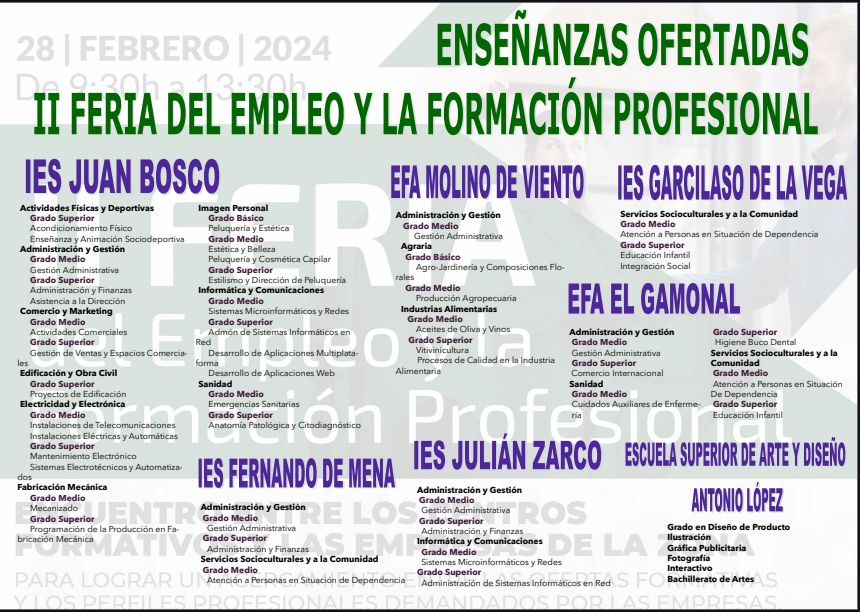 Este miércoles, día 28 de febrero, la EFA Molino de Viento organiza, en colaboración con CaixaBank Dualiza, la Cámara de Comercio de Ciudad Real, la Diputación Provincial, y el Ayuntamiento de Campo de Criptana, la II Feria del Empleo y la Formación Profesional. Un encuentro que aspira a potenciar el papel de la orientación desde los centros educativos, dando a conocer la oferta formativa de la Formación Profesional de nuestro entorno, así como a explicar el itinerario profesional y la empleabilidad que conlleva.