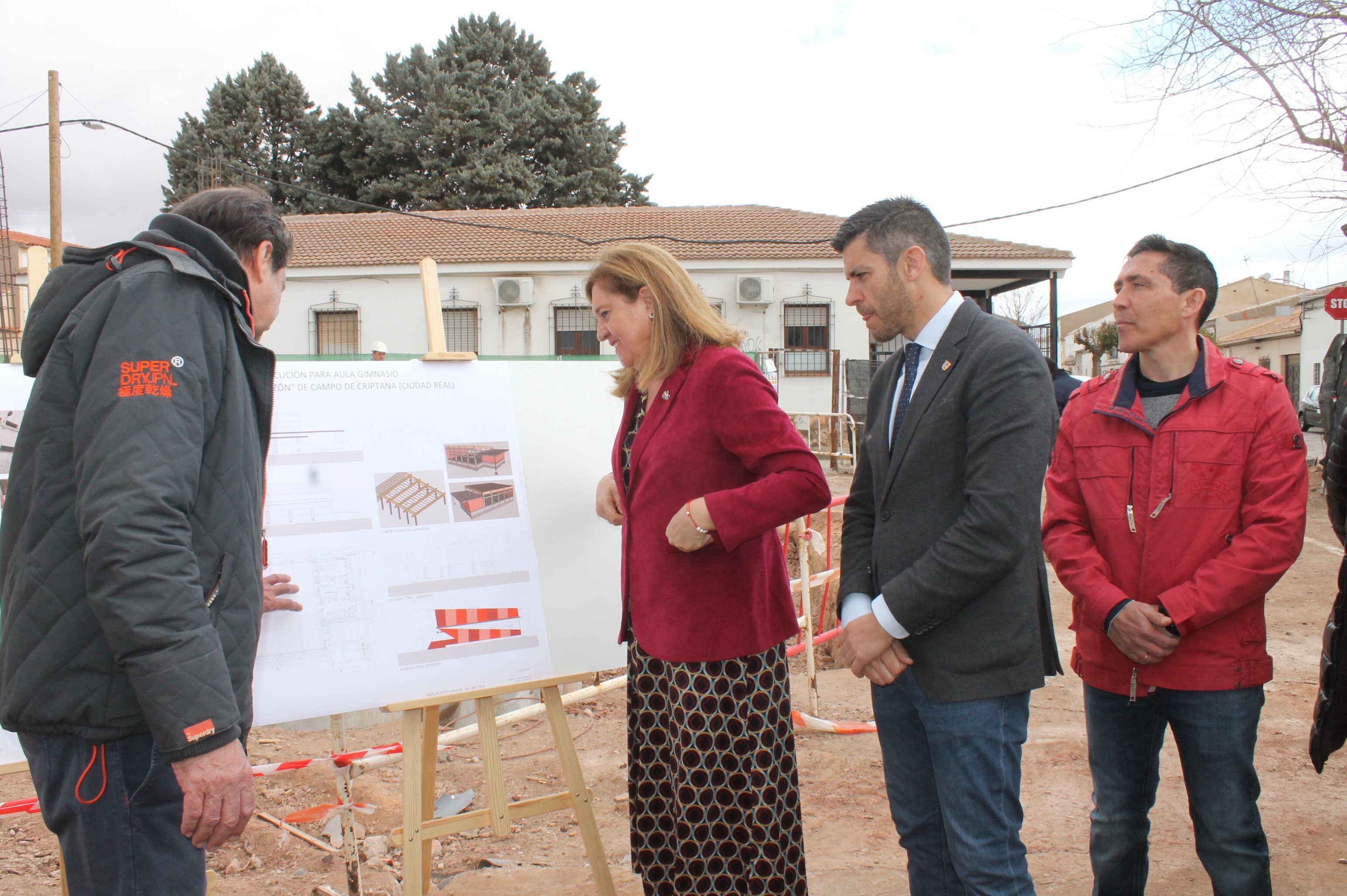 La consejera de Educación, Rosa Ana Rodríguez, ha visitado este lunes las obras de construcción del nuevo gimnasio polivalente que se está construyendo en el colegio Sagrado Corazón de Campo de Criptana y que estará terminado a finales de junio, una instalación que podrán usar asociaciones y colectivos del municipio, tal como ha explicado el alcalde, Santiago Lázaro.