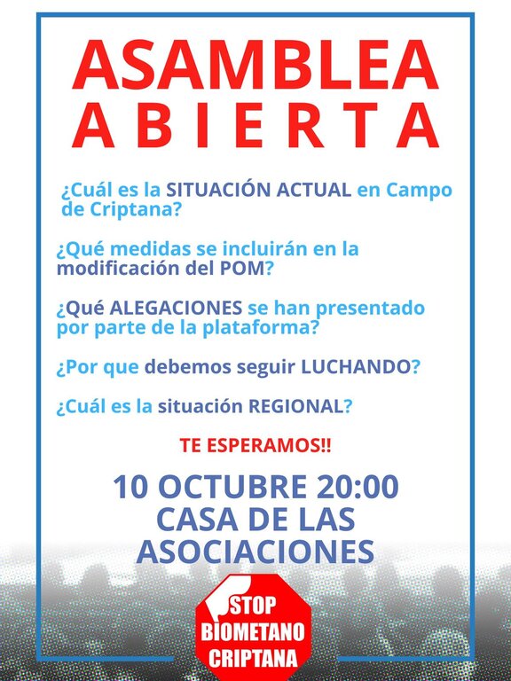 La plataforma Stop Biometano Criptana celebrará una nueva asamblea ciudadana este viernes, 10 de octubre, a las 20:00 horas en el salón de actos de la Casa de las Asociaciones (calle Álvarez de Castro, s/n), con el propósito de mantener informada a la población sobre la evolución de su trabajo y la situación actual de los proyectos de biometano previstos en el término municipal.