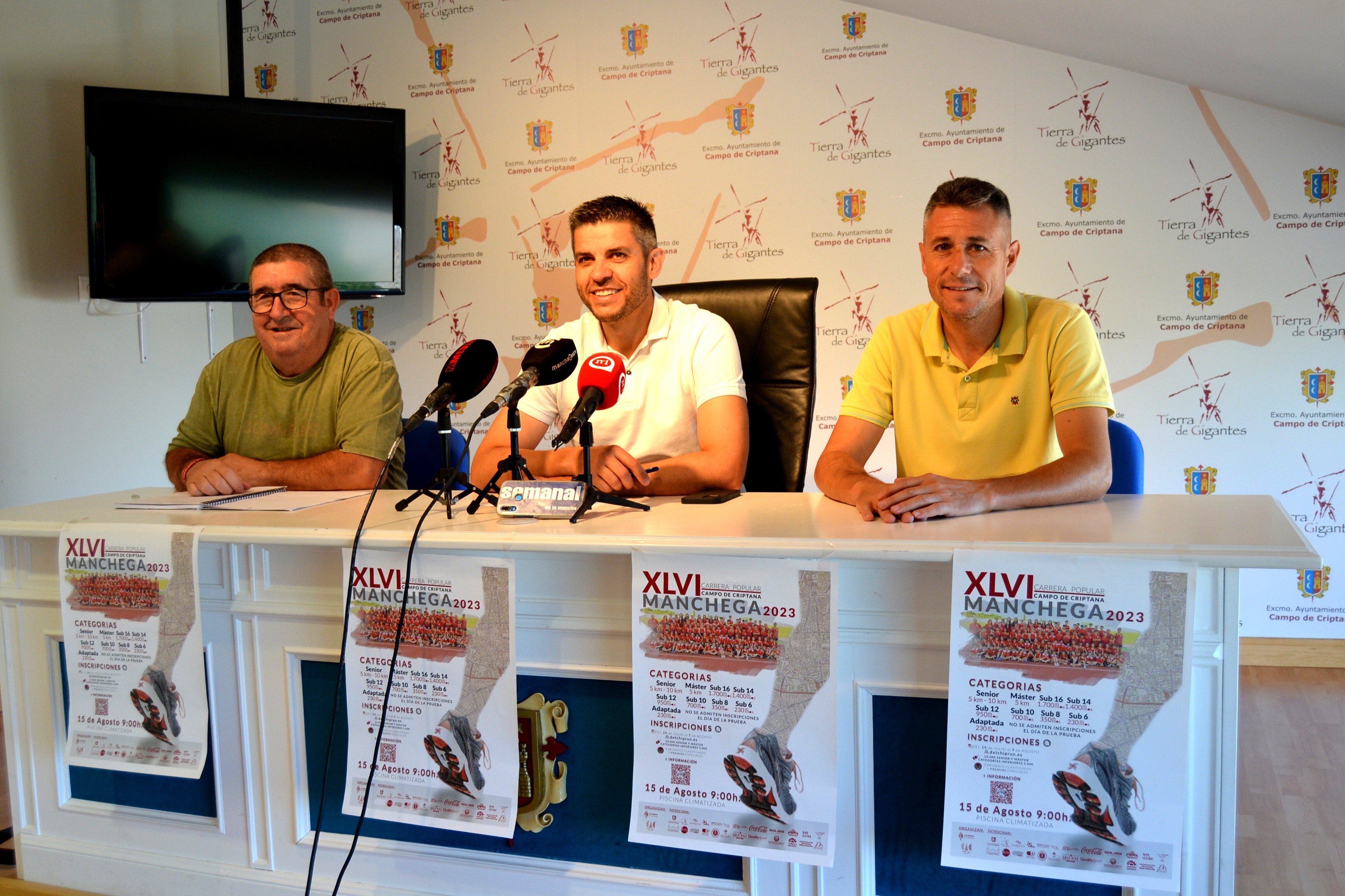 El alcalde de Campo de Criptana, Santiago Lázaro y el concejal de Deportes, José Andrés Ucendo, acompañados por el presidente del Club Atletismo Criptana, Lorenzo Leñero, han presentado esta mañana en rueda de prensa la XLVI Carrera Popular Manchega, que se celebrará el día 15 de agosto.