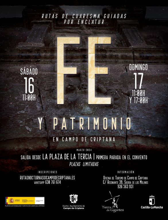 Las rutas son gratuitas y con plazas limitadas, las personas interesadas deben realizar la inscripción previa y la reserva a través del correo electrónico: rutasnocturnas@campodecriptana.es o por vía telefónica mediante el envío de un WhatsApp al número 630 761 674. Indicando el nombre, el número de personas que realizarán la ruta, así como la fecha solicitada. Más información en la web https://tierradegigantes.es/ y la oficina de turismo de Campo de Criptana, teléfono: 926 56 39 31 .