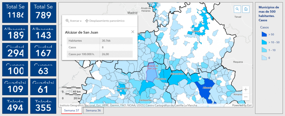 El resto de municipios han registrado datos a la baja. En Alcázar de San Juan, 12 casos en la semana 36 y 8 en la semana 37, es decir 20 nuevos positivos entre el 6 y el 19 de septiembre; en Campo de Criptana, de 46 registrados la semana 36, se han pasado a 6 en la semana 37, sumando por lo tanto 52 en los 15 días; en Herencia, 9 en la semana 36 y ningún caso en la semana 37; en Manzanares, 11 más 12, es decir 23 nuevos positivos entre las dos semanas; en Pedro Muñoz, 7 casos en total, 2 en la semana 36 y 5 en la semana 37; y en Socuéllamos, 29 en total, 14 en la semana 36 y 15 en la semana 37.