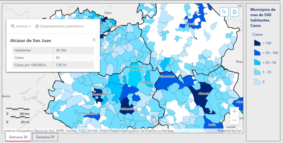 En cuanto a los pueblos toledanos, en Miguel Esteban, la situación ha pasado de 23 en la semana 29, a 5 en la semana 30, es decir, 28 en total, con clara tendencia a la baja. En Quero, de 0 casos a 3 (también es de los pocos municipios donde que suben los positivos comparando las dos semanas). En Quintanar de la Orden, los quince días suman 55 nuevos casos, 40 en la semana 29 y 15 en la semana 30. En El Toboso, las dos semanas suman un caso, registrado en la semana 30. En Villacañas, 19 en total, con 13 en la semana 29 y 6 en la semana 30. En Villa de Don Fadrique, 2 casos, uno casa semana. Y, finalmente, en Villafranca de los Caballeros, de 13 nuevos positivos en la semana 29, han pasado a 4 en la semana 30, con un total de 17 en los quince días de registro.