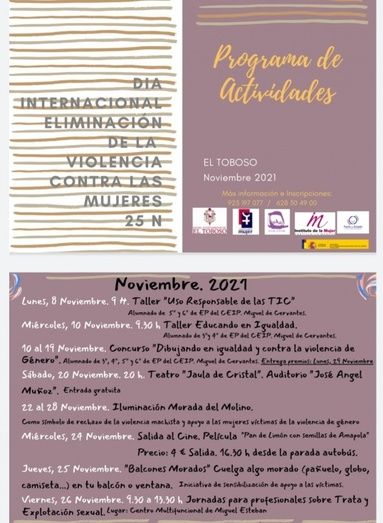 Con motivo del Día Internacional de la Eliminación de la Violencia hacia las Mujeres, que se conmemora el próximo 25 de noviembre, el Ayuntamiento de El Toboso en colaboración con el Centro de la Mujer ha organizado diferentes actividades dirigidas a todos los públicos.