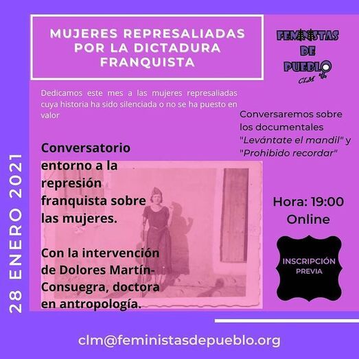 Con la intención de contribuir a reducir el olvido en el que yacen sepultadas, la asociación Feministas de Pueblo ha contado con la colaboración de una experta en la investigación sobre la represión de las mujeres durante el franquismo, la doctora en antropología Mª Dolores Martín-Consuegra Martín-Fontecha. Su participación en las actividades de la Asociación es doble: ha escrito, por un lado, el artículo que a continuación se reproduce, titulado “Memorias sobre la feminización de la represión franquista en Castilla-La Mancha”, y, por otro lado, va a intervenir como invitada principal en el conversatorio que tendrá lugar el próximo jueves, 28 de enero, a propósito del corto Levántate el mandil y del documental Prohibido recordar. Cualquiera puede participar en la reunión virtual si solicita su inscripción a través del correo electrónico clm@feministasdepueblo.org