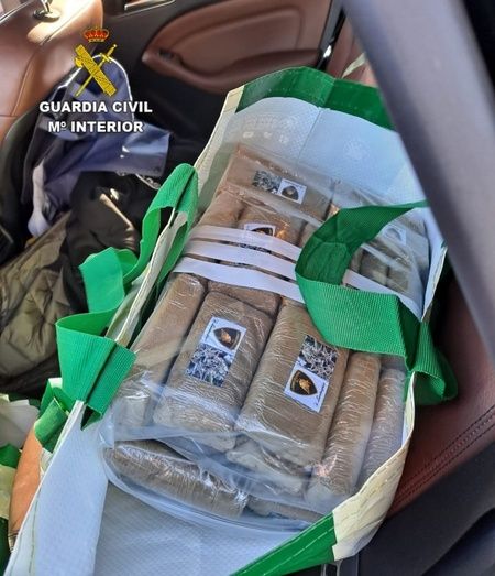 Mientras que el conductor y único ocupante del vehículo era identificado, el perro marcó varias bolsas de supermercado en los asientos traseros como posibles puntos donde pudiese encontrase algún tipo de droga. Allí, los guardias civiles hallaron un total de 420 paquetes envueltos con una sustancia marrón en su interior, concretamente hachís, que arrojaron un peso exacto de 46,7 kilogramos.