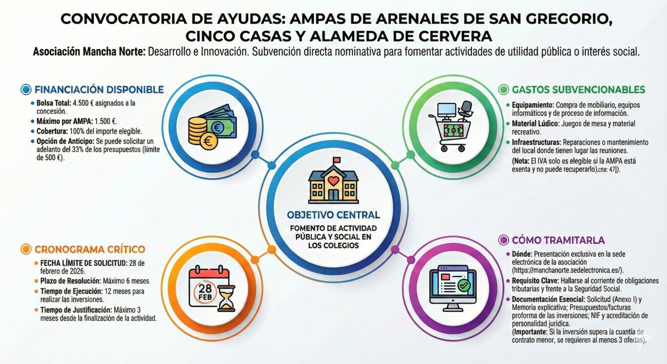 La Asociación para el Desarrollo y la Promoción de la Mancha Norte de Ciudad Real ha aprobado una convocatoria de ayudas dirigida a las Asociaciones de Madres y Padres de Alumnos (AMPAS) de Arenales de San Gregorio, Cinco Casas y Alameda de Cervera, con el objetivo de reforzar su capacidad de actuación y apoyar la mejora de la educación en estos núcleos de población.