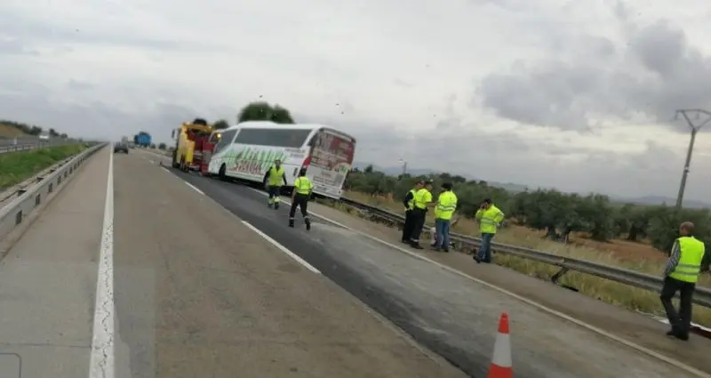 Al parecer, el autobús estaba realizando la línea Madrid-Sevilla-Huelva y tras colisionar con el camión se ha salido de la vía, pero no ha volcado.