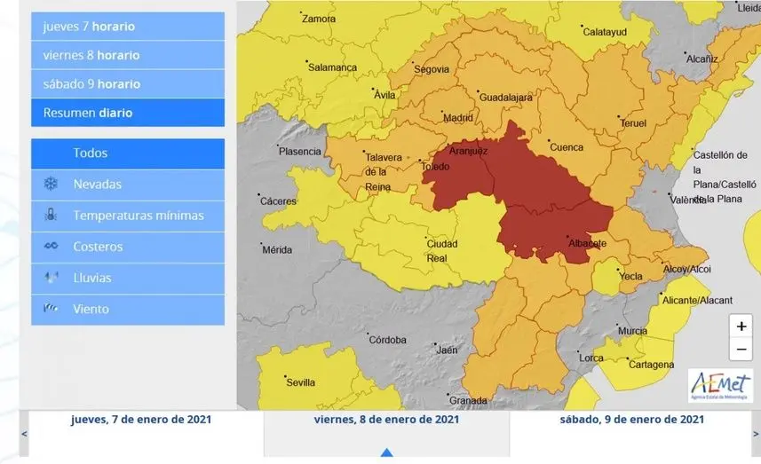 La Agencia Estatal de Meteorología ha activado la alerta por riesgo extremo por fuertes nevadas en toda La Mancha toledana el viernes, 8 de enero de 2021.
