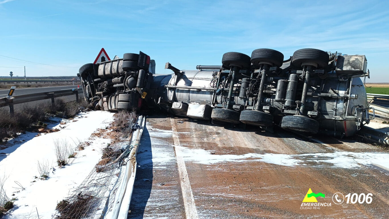 Un camión cisterna ha volcado esta mañana en la autovía A-43, a la altura del kilómetro 75, en sentido Extremadura, dentro del término municipal de Argamasilla de Alba.