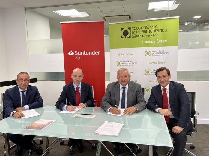 El acuerdo ha sido firmado por el Director Territorial de Santander en Castilla-La Mancha, Miguel Ángel Franco y por el presidente de Cooperativas Agro-alimentarias CLM, Ángel Villafranca. Al acto asistieron también el director de Cooperativas, Juan Miguel del Real, y el Responsable Agro de Banco Santander en La Mancha, Pedro Bergillos.