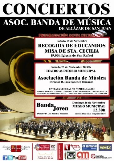 Los conciertos de Santa Cecilia de la Asociación Banda de Música serán el sábado 25 a las 20.30 horas en el Teatro Auditorio Municipal con un precio de la entrada de tres euros, pudiéndose adquirir en TempoMúsica (en la C/ Bailén), a través de los propios músicos de la ABM o el mismo día del concierto a partir de las 19.00 horas. La Banda Joven de la Asociación también ofrecerá un concierto el domingo 26 a las 12.30 horas en el Museo Municipal de Alcázar de San Juan con entrada libre hasta completar aforo.