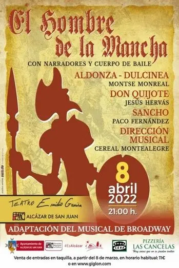“El hombre de La Mancha” es una adaptación del musical de Broadway con narradores y cuerpo de baile que en esta ocasión estará dirigido por el alcazareño Cereal Montealegre, con Montse Monreal como Aldonza-Dulcinea, Jesús Hervás como Don Quijote y Paco Fernández como Sancho.