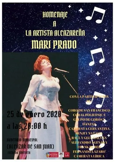 El próximo sábado 25 de enero, a las 20.00h, se llevará a cabo el homenaje a la artista alcazareña Mari Prado (conocida artísticamente como “María Rolando”) en el Auditorio Municipal de Alcázar de San Juan.