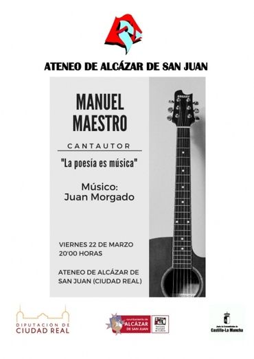 El Ateneo de Alcázar va a contar este viernes, 22 de marzo, con la actuación del catautor Manuel Maestro y su espectáculo “La poesía es música”. Maestro estará acompañado con el música Juan Morgado. La actividad dará inicio a las 20:00 horas en la sede del Ateneo.