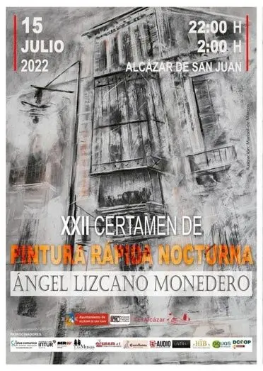 Este viernes, 15 de julio, se celebra en Alcázar de San Juan el XXII Certamen de Pintura Rápida Nocturna “Ángel Lizcano Monedero” desde las diez de la noche a las 2 de la madrugada del sábado 16 de julio. El Ayuntamiento de Alcázar de San Juan, a través del Patronato Municipal de Cultura, convoca este certamen con el objetivo de promover y difundir el patrimonio de la ciudad y premiar la creación pictórica contemporánea, así como incrementar los fondos municipales de pintura con nueva obra.