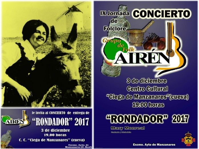 El próximo domingo, 3 de diciembre, a las 7 de la tarde, en el Centro Cultural “Ciega de Manzanares” (Cueva), de Manzanares, con la colaboración delAyuntamiento de Manzanares, el Grupo Folk Airén, hará entrega a la alcazareña Mary Monreal “cantante y folclorista”, del galardón “Rondador’2017”, en el transcurso de las IX Jornadas de Folklore y del concierto que este grupo folk, con más de catorce años de existencia, ofrecerá a cuantas personas asistan a este evento.