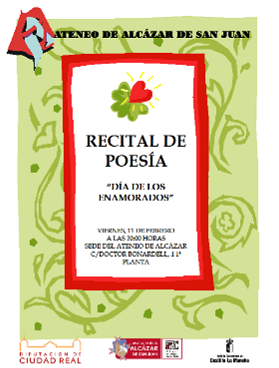 Los miembros del Grupo Literario del Ateneo de Alcázar de San Juan han organizado, como cada año, un Recital Poético que va a girar en torno a esa palabra tan importante a lo largo de los tiempos, el amor, el amor en su más amplio sentido de la palabra. Y lo harán tomando diversos poemas de autores consagrados como Pablo Neruda, Luis García Montero, Sabina o Gustavo Adolfo Bécquer, y de autores menos conocidos, pero con un gran oficio como Julia Prilutzky y Maruja Viera, y cómo no el propio Ateneo.