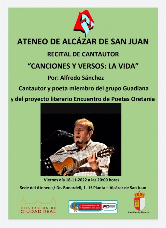 El Ateneo de Alcázar de San Juan continúa su programa de actividades. Este viernes, a partir de las 20:00 horas, en su sede, ofrecerá un recital musical a cargo del cantautor y poeta Alfredo Sánchez, miembrodel grupo Guadiana y del proyecto literario Oretania.