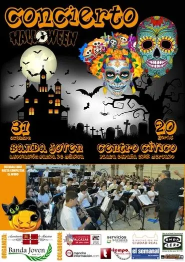 La Banda Joven de la ABM de Alcázar de San Juan no deja de sorprender una vez más y ante la proximidad de la fiesta de “LA NOCHE DE LOS MUERTOS DE HALLOWEEN” está preparando un Concierto temático con obras musicales adaptadas de grupos pop-rock como ABBA o QUEEN, “This is Halloween” entre otras partituras. Además, todos los músicos de la Banda Joven irán caracterizados y disfrazados para la ocasión.