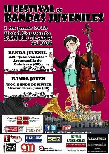 Alcázar de San Juan acogerá este viernes, 1 de junio, el II Festival de Bandas Juveniles que se va a celebrar a las 21:00 horas en el patio del Hotel Convento Santa Clara. Previo al concierto se realizará un pasacalles desde la Plaza de España que dará inicio a las 20.30h.