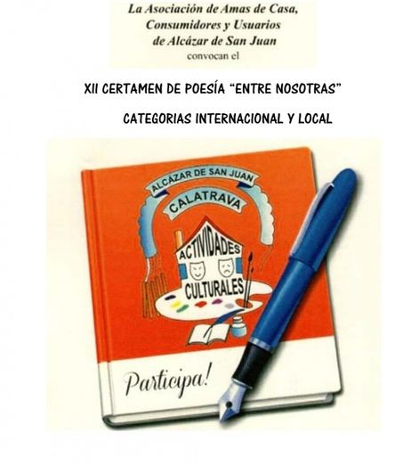 La Asociación de Amas de Casa, Consumidores y Usuarios Calatrava de Alcazar de San Juan ha lanzado una nueva edición de su Certamen de Poesía “Entre Nosotr@s”, la duodécima, que este año tiene como novedad el hecho de que cuenta con dos categorías para participar, una internacional, siempre que la obra esté en lengua española, y otra local. El plazo de entrega de trabajos finaliza el 27 de febrero.